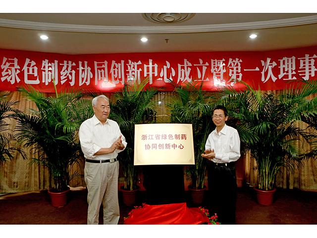 会上,沈寅初和梅新林共同为浙江省绿色制药创新中心揭牌。会议审议通过了绿色制药协同创新中心理事会理事、监督委员会委员及中心机构设置、首席科学家、方向平台负责人、理事会秘书长等名单,审议通过了《绿色制药协同创新中心章程》和多项绿色制药协同创新中心主要运行制度,选举产生了绿色制药协同创新中心理事会理事长、副理事长。