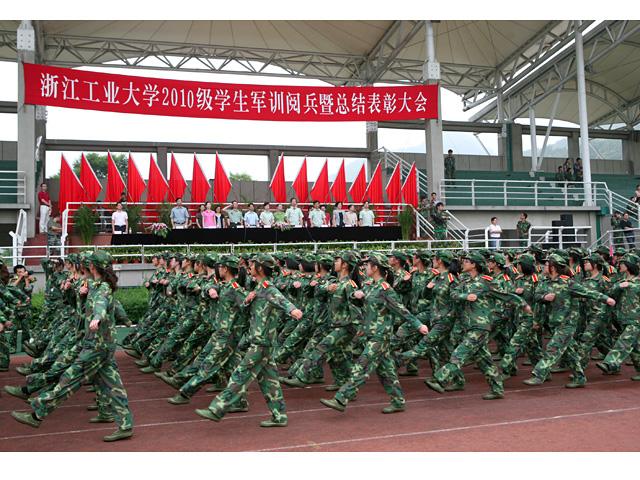 7月15日,学校分别在屏峰校区和之江校区举行了2010级学生军训阅兵暨总结表彰大会。军训师政委、校党委副书记何智蕴主持大会,军训师师长、副校长盛颂恩在驻训首长、军训师副师长吴建新中校的陪同下检阅参训学