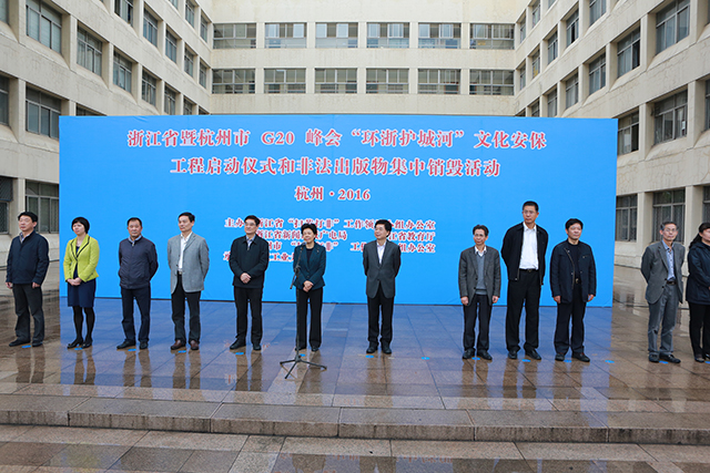 为迎接“4·26”世界知识产权日,4月21日,2016年浙江省暨杭州市G20峰会“环浙护城河”文化安保工程启动仪式和非法出版物集中销毁活动在我校朝晖校区举行。省委常委、宣传部长、省“扫黄打非”工作领导