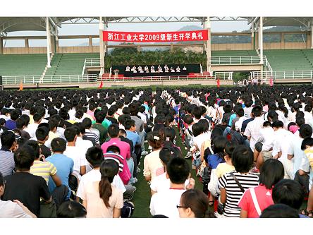 9月10日上午,2009级新生开学典礼在屏峰校区操场隆重举行。学校党政班子成员汪晓村、张立彬、沈传缘、何智蕴、肖瑞峰、马淳安、李小年、张志军出席典礼。来自全国 31个省(市、自治区)的7777名本科新