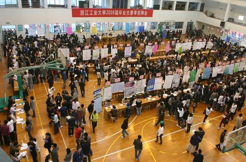 3月21日,学校在朝晖校区体育馆举办了2009届毕业生春季招聘会。校党委副书记何智蕴到招聘会现场看望了毕业生和用人单位代表。据统计,中国石化镇海炼化分公司、浙江省土产畜产进出口集团有限公司、杭州市燃气
