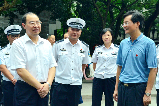 8月9日下午,浙江省委常委、政法委书记、省公安厅党委书记、厅长徐加爱一行来校考察调研校园交警服务站工作,实地走访了保卫处综合服务大厅、党员服务站。校党委书记蔡袁强,杭州市交通警察支队队长金洪亮,校党委